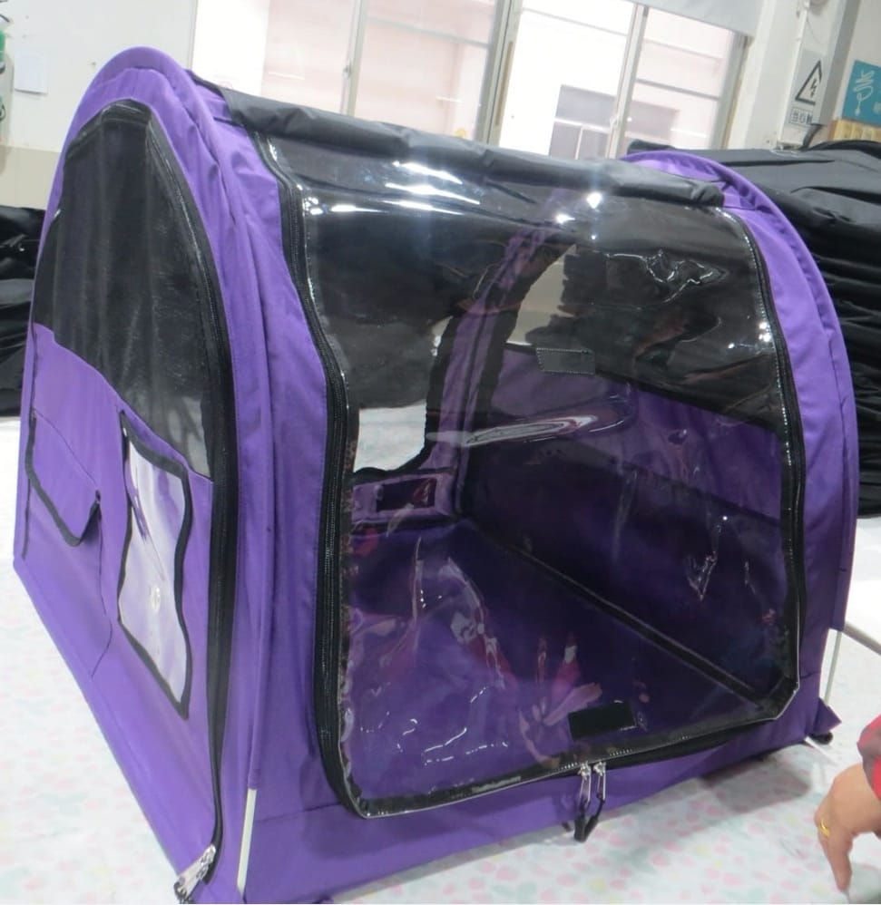 ja toisella puolen läpinäkyvä vinyyli-ikkuna rullattavalla, häkinvärisellä näkösuojalla varustettuna.