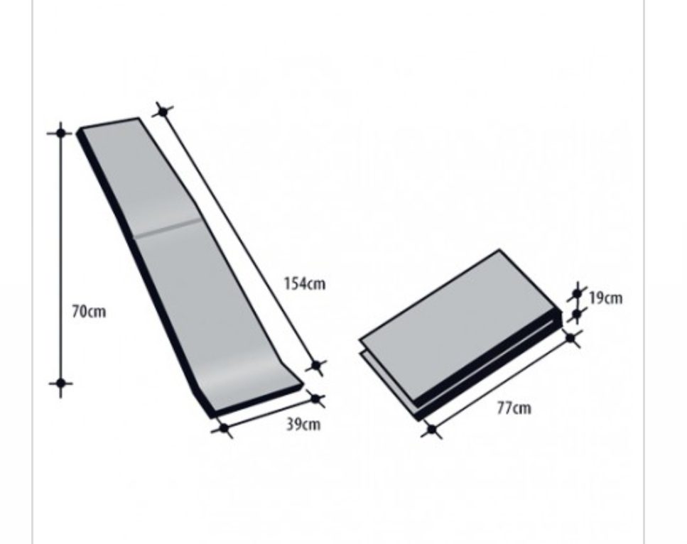 Kokoontaitetun rampin mitat: pituus 77cm; leveys 39cm; paksuus 19cm.