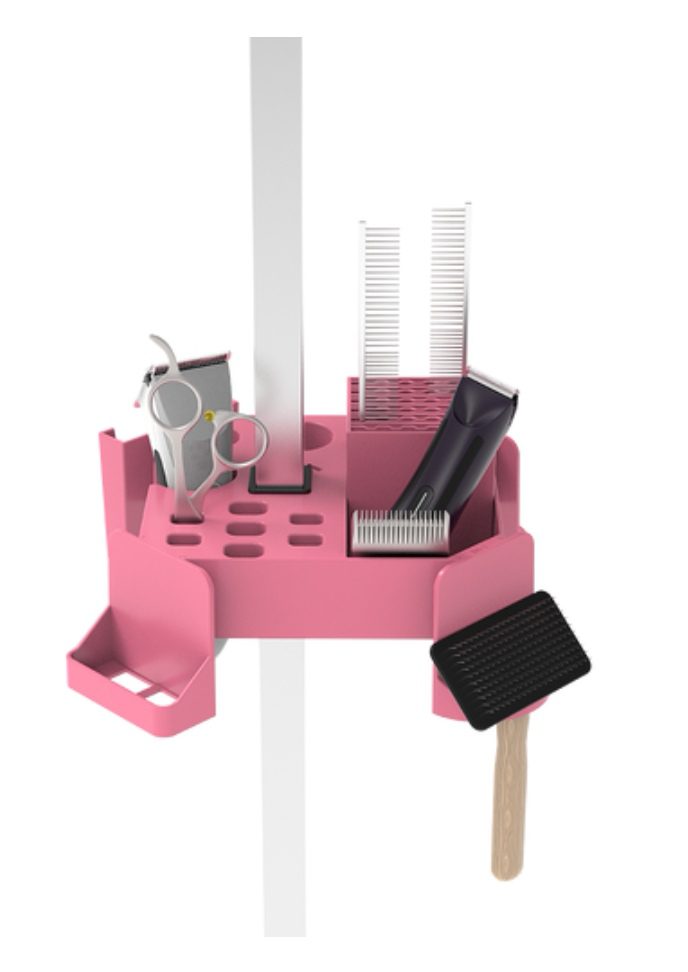 Yksi varsitelineen etu on, että trimmauspöydällä ei loju tarvikkeita, jotka pudotessaan vaurioituisivat helposti. Keskittämällä pienet trimmaustarvikkeet telineeseen ne löytyvät myös helposti ja nopeasti.